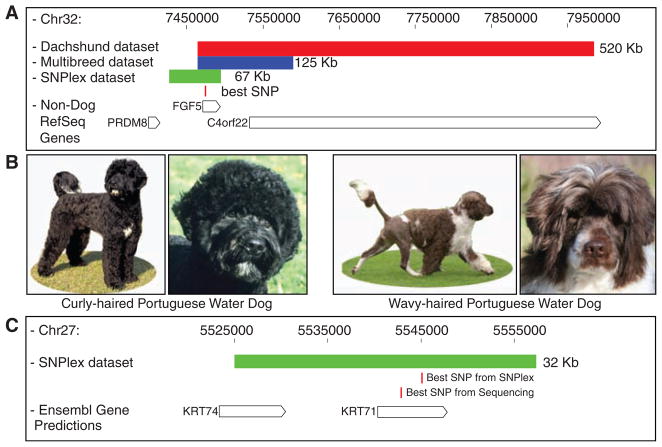 Finally, to map the curly fur phenotype, the researchers used a Portuguese Water Dog SNP database, with curly-haired dogs as the cases and wavy-haired dogs as the controls (phenotypes shown in Fig. 2B).  They identified a linkage region on canine chromosome 27 that overlapped with two keratin genes (Fig. 2C; haplotype identified through fine mapping indicated with the green rectangle).  Through sequencing, the team found a nonsynonymous Arg to Trp alteration in the keratin-71 gene, KRT71.  Keratins are well-known structural proteins found in both hair and nails, and the researchers suspect that this alteration to the second exon of KRT71 may result in altered protein folding or cellular localization, changes which ultimately manifests themselves as the curly-haired phenotype.