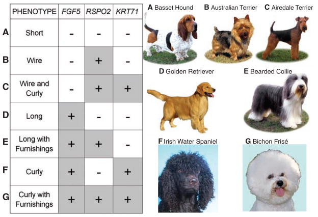 When considered in combination, these three mutations are able to explain 95% of the variation seen in fur phenotype among the dogs sampled.  Analysis of wolves and short-haired dogs revealed that they harbored none of the three mutations found, indicating that short-haired dogs without furnishings or curl represent the ancestral coat phenotype for dogs (ancestral genotype conditions are indicated by “-“ signs in the boxes within Fig. 3).  Different combinations of FGF5, RSPO2, and KRT71 mutations result in the appearance of 6 unique dog coat phenotypes.  Figure 3 shows the mutation combinations that result in the different coat varieties (rows A-G; “+” signs indicate the presence of the mutant genotype for a particular gene) with dogs representative of each phenotype shown to the right of the table.