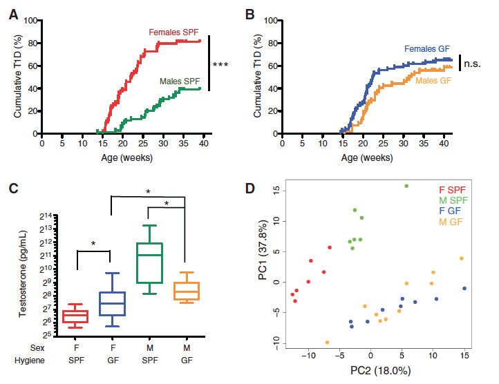 There is evidence from previous studies that (T1D) is positively correlated with better hygiene status, so these researches are interested in researching the effect of the gut microbiome on autoimmunity. The researchers subjected NOD mice to either specific-pathogen-free (SPF) or germ-free (GF) environments, and Figure 1A  and 1B show the cumulative % of T1D over a few weeks time for these two conditions. In the SPF condition (Fig. 1A), females had a significantly higher cumulative % of T1D than males, but there was no significant difference in GF condition (Fig. 1B).  The relative protection of males in the SPF setting appeard to be dependent on the presence of commensal organisms.
