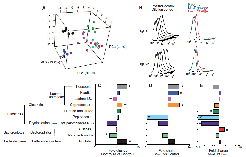It was useful to know whether or not the transplantation was inducing an immune response, and whether or not the transplantation was altering the bacterial composition of recipient NOD mice. To address the first issue they measured systemic IgG1 and IgG2b for M --> F and F --> F gavage, as well as F control (Fig 2B. right histograms). They inoculated mice with bacteria for a positive control (Fig 2B. left histograms). According to these results, there was no immune response to the transplantation. To address the second issue, the researchers performed 16S rRNA sequence pairwise comparisons and showed the 10 bacterial genera that were found to be significantly different in at least one of the comparisons (Fig. 2C). This makes me wonder if there are any pathogenic bacteria genera that prefer females over males and vice versa.