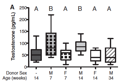 To follow up their findings correlating male microbiome with higher testosterone levels (Fig. 1C), they wanted to see if they could induce testosterone level changes through cecal transplantation from males to females. As shown in Figure 3A, females that received bacteria from age-matched males had significantly higher serum testosterone than control females, F --> F, and females with male donors 34 weeks old (letters A and B displayed above box-whisker plots indicate significance). It is peculiar to me that females with male donors 34 weeks old do not follow the same trend as females with male donors 7 and 14 weeks old. This could simply be because hormone production in general decreases with age, and so gut microbiome loses its affect over hormone production over time.