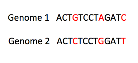 Figure 1. The diagram shows the same loci in two different genomes. The red letters signify SNPs. (Adapted from The International HapMap Consortium, 2003.)