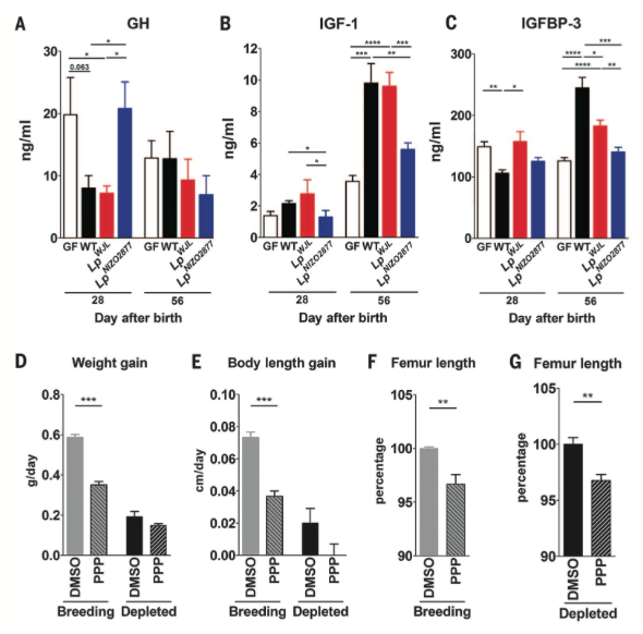 Figure 4 shows activity of the somatotropic axis in WT mice, GF mice, and mice monocolonized with either of the two L. plantarum strains when raised on nutrient depeleted diets. Like figure 2, figure 4 shows circulating levels of GH, IGF-1, and IGFBP-3 in mouse sera at different stages of growth (A-C). GH levels in WT and LpWJL was significantly decreased compared to GF and LpNIZO2877 at 28 days after birth. Levels of IGF-1 and IGFBP-3 at 56 days were increased in WJ and LpWJL mice and to a lesser extent, in LpNIZO2877 mice. This data is consistent with Figure 2 in suggesting that the somatotropic axis is less active in GF mice. Finally, WT mice injected with a PPP compound (IGF-1 inhibitor, and therefore inhibitor of the somatotropic axis) experienced less growth when compared to a DSMO control, and treated and untreated mice raised on depleted diets experienced less growth than mice raised on breeding diets. In summary, this figure shows that somatotropic activity is lower in GF mice and that microbiota are essential for growth.