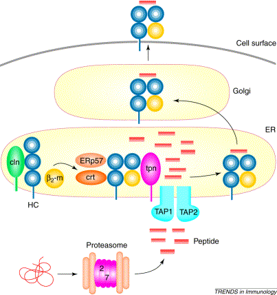 Once the peptide fragments enter the ER, tapasin then assists in the binding of the peptide fragments to the MHC I complex. The MHC I complex is then complete and ready to be exported to the outer cell membrane so that it can present its peptide fragment to immunoglobins (Grandea A G et. al. 2001).