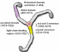The structure of clathrin is described as a " triskelion " which comprises of three heavy chain legs. Each one of the legs is 1675 aa long and has a approximate weight of 192 kDa (Pearse, B et al). Each leg consists of four main domains; the N-terminal end ( 1-494 aa ) which is where the the clathrin legs harbor clathrin binding sites which bind to vesicles, the distal domain ( 495-1073 aa ) and proximal domains which are involved in associating with other clathrin proteins to form the coating lattice structure around vesicles, and the C-terminal end ( 1550-1675 aa ) which is where the legs of the clathrin join to form the central trimerization domain (txd).
