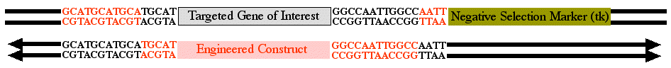 Fiugre 2. Diagram of engineered construct that will be used to replace the wild-type allele. The upstream and downstream flanking DNA sequences are identical to those which flank the targeted locus. The negative marker tk is shown in to the right of the region of sequence similarity.