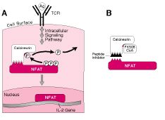"T cells express low levels of calcineurin, so they are more sensitive to inhibition of this pathway than are many other cell types," which results in increased selectivity (Janeway et al 1999). The important role of NFAT "in T-cell activation is illustrated by the effects of the selective inhibitors of NFAT called cyclosporin A and FK506 (tacrolimus)" (Janeway et al 1999). These immunosuppressive drugs inhibit allograft rejection in organ transplant patients. Cyclosporin A (see figure 1) enters the cytoplasm and binds to the intracellular immunophilin cyclophilin and then forms a complex with calcineurin, which prevents calcium from binding to and activating calcineurin.