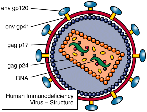 The viral envelope of HIV is composed of two layers of fatty molecules that are taken from an infected cell when the new virus buds off.  Underneath the fatty molecules is a layer of matrix protein called p17.  The HIV virion contains two important envelope proteins.  Gp160 is a glycoprotein that is cleaved into gp120 and gp41, which are expressed as trimers to make up the viral envelope (Janeway et al. 1999).  The gp120 moiety binds the virion and host via a CD4 receptor, whereas, gp41 is believed to induce fusion of the virus to the host cell membrane as well as anchor gp120 (Felser et al. 1988).  On average 72 copies of the protein Env, containing three to four gp120 and three to four gp41 molecules, exist on the virus surface (Gelderblom et al., 1987 and Chan et al., 1998).
