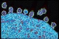 | Figure 9- A scanning electron microscope image of HIV daughter cells budding from an infected host cell. Used wither permission of <http://www.cmsp.com/datav1/cg010001.htm>. |