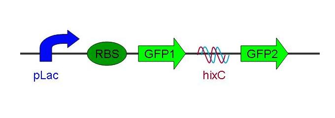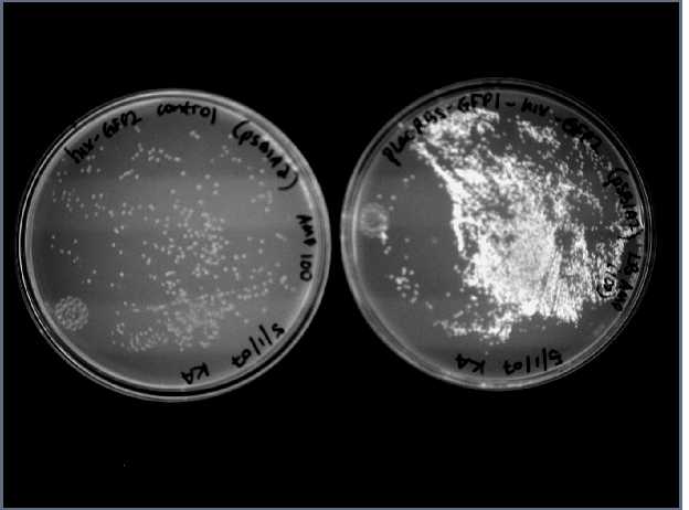 E. coli cells transformed with the GFP construct glow green under UV light (plate on right). The HixC sequence does not interfere with GFP function.