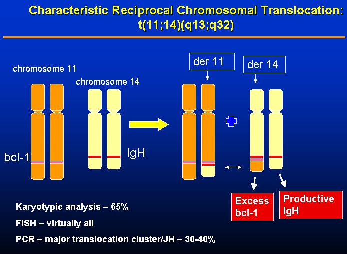 Approximately 70 percent of MCL cases are associated with a chromosome translocation at t(11;14)(q13;Q32) (see Figure 1)(Freedman and Harris, 2005). This translocation involves the cyclin D1 locus (which includes bcl-1) on chromosome 11 and the immunoglobulin heavy chain (IgH) locus on chromosome 14 (Freedman and Harris, 2005). Juxtaposition of the cyclin D1 gene to the potent B-cell IgH transcription enhancers leads to its overexpression (Freedman and Harris, 2005). Cyclin D1 is a protein synthesized in the late G1 phase of the cell cycle that helps induce progression into the S phase through the activation of cyclin-dependent kinases (Yatabe et al., 2000). Withdrawal from the cell cycle also seems to be dependent on suppression of cyclin-D1 (Yatabe et al., 2000). Overexpression of cyclin-D1 due to the previously mentioned chromosomal translocation is believed to be the major cause of the uncontrolled proliferation of MCL (Yatabe et al., 2000). In the 30 percent of cases of MCL that do not show a documentable rearrangement at t(11;14)(q13;q32), cyclin-D1 is still usually overexpressed; however, the mechanism for the cyclin-D1 overexpression in these case remains uncertain (Swerdlow et. al 1995). A small percentage of MCL cases are without overexpression of cyclin-D1, and this absence of cyclin d1 overexpression has been associated with favorable prognosis (Yatabe et al., 2000).