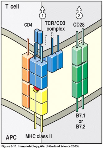 Figure 1. Two signals are necessary for complete T cell activation. The first is provided by the binding of the T cell receptor to its specific peptide:MHC molecule. The co-stimulatory signal is provided by the binding of a B7 molecule on the antigen presenting cell (APC) to its ligand, CD28, on the T cell (Janeway et al., 2005).