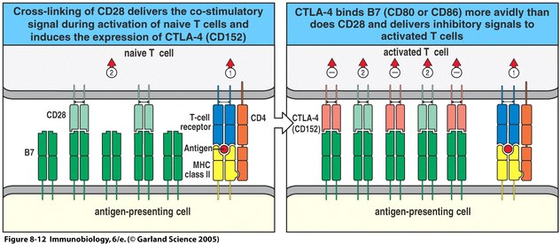 The drastic changes that come with T cell activation require that the process be tightly regulated. Signaling through the B7 molecules, then, must be efficiently controlled. This regulation is carried out by a second ligand of the B7 molecules, CTLA-4 (CD152). The expression of CTLA-4 on T cell surfaces only begins after the T cell's activation. CTLA-4 molecules bind roughly 20 times more tightly than CD28 to the B7 molecules. This means that as T cell activation continues, more CTLA-4 is being expressed on the T cell surface (Janeway et al., 2005). Although CTLA-4 expression never gets to be as dense on the T cell surface as does CD28 (only about 2-5% of CD28 expression level), the much higher avidity for the B7 molecules effectively decreases the strength of the B7:CD28 signaling pathway. One model of this decrease suggests that when high amounts of B7 molecules are being expressed following activation of the T cell, both the CD28 and CTLA-4 ligands are binding the B7 molecules. This model says that once B7 expression starts to decrease, the vast majority of the remaining surface B7 molecules are bound by CTLA-4 because of its higher avidity for B7 (Freeman et al., 1998). In this way, the B7:CD28 signals are controlled and production of IL-2 within the activated T cell is maintained at an appropriate level.
