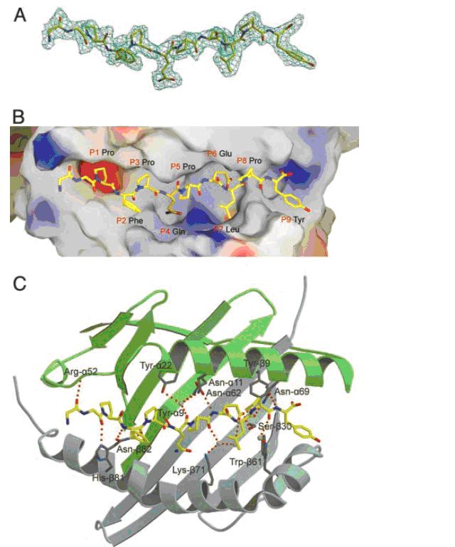 (A)Model of the gliadin peptide. (B) Surface of HLA-DQ with bound gliadin peptide to red region. (C) Hydrogen-bonding network in the HLA-DQ-gliadin complex (image from Kim, C. et al., 2004, permission pending).