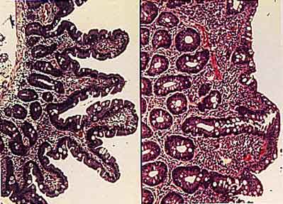 Hematoxylin-eosin stained cross-sections of intestinal villi: normal epithelium (left) and celiac epithelium (right), characterized by infiltration of intraepithelial lymphocytes and flattened villi.