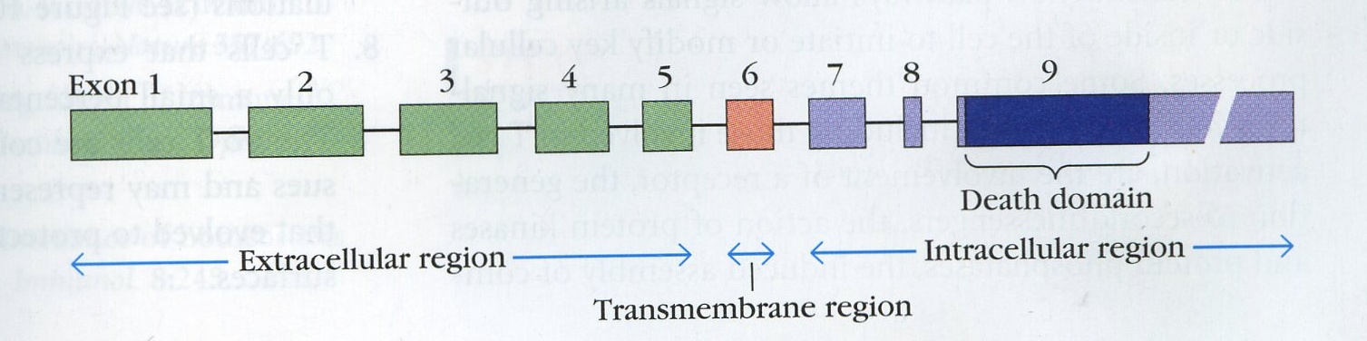 Figure 2. The map of the Fas locus. Exons 1 through 5 encode the extracelluar region. Exon 6 encodes the transmembrane region. Exons 7-9 encode the intracellular region. The cut shown depicts where a possible mutation could be, near the death domain, that would prevent a Fas/FasL from transducing a signal. (Goldsby et al, 2002)