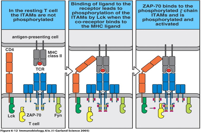 TCR signaling initially involves two Src-family kinases, Lck and Fyn. When antigen is recognized, the TCR complexes cluster. Clustering brings Lck, which is associated with the cytoplasmic domain of the co-receptor, to its targets in the TCR complex. Lck phosphorylates immunoreceptor tyrosine-based activation motifs (ITAMs) on the cytoplasmic domains of the ζ and the CD3 δ, γ, and ε chains of the TCR complex. The SH2 domains of the protein-tyrosine kinase ZAP-70 subsequently bind to the phosphorylated ζ chain. Upon binding, ZAP-70 is activated and propagates the signal cascade. Ultimately, the signal cascade results in the activation of the transcription factors NFAT, AP-1, and NFκB in the nucleus and the T cell is activated (Janeway et al., 2005).