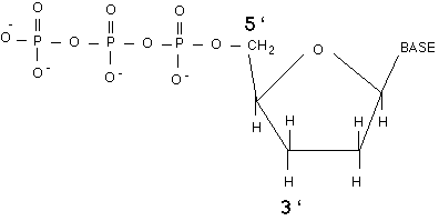 1. Draw a nucleotide that makes DNA sequencing possible (not an ordinary nucleotide). To receive full credit, you must draw all of the atoms except for the base which you may label with a single letter. Also, label the 5' and 3' ends properly.