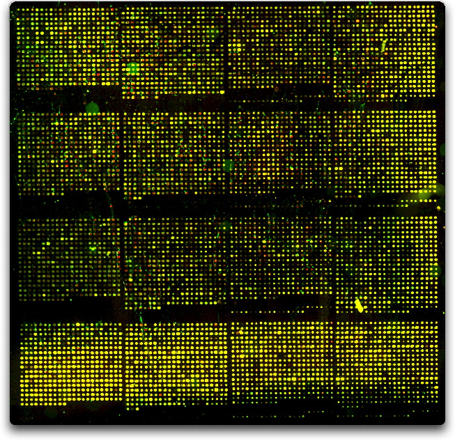 GH means you isolate total genomic DNA from two strains, label them different colors, and hybridize them to a normal yeast (that's what we use) DNA microarray. If the yeast has experience aneuploidy, then the genes that are duplicated or deleted will display green or red. Genes that are present at the same level in both strains will appear yellow. Below is a snapshot from an experiment that compared the same cell to itself. You can compare this result to those produced by published works at Stanford.