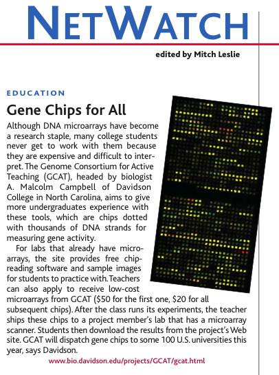 3) You have to pay for the chips and are responsible for any additional costs associated with making probes, growing cells, and sending me the chips for scanning, etc. The pricing of the chips is modest (no more than $60 for the first of each species per semester to pay for all shipping costs and $20 for each additional chip to pay for scanning and the scanner's service contract). This cost includes ever increasing FedEx delivery of the chips to you and scanning of the chips by GCAT. Neither Malcolm Campbell nor Davidson College keep any of the money for local use.
