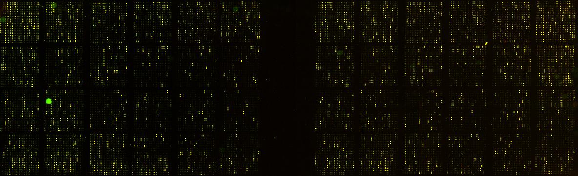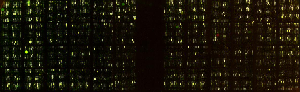 Here are some sample data from Mary Lee Ledbetter's undergraduate lab at Holy Cross. These data were obtained with the same RNA sample, so all spots "should" be equal (i.e. yellow). Scans were conducted twice to obtain faint signals (long exposure) and to prevent saturation of the CCD camera (short exposure). The RNA was isolated from exponential phase cells grown aerobically on glucose. ISB slide number was 2828