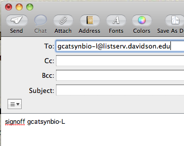 If you want to unsubscribe from GCATSynBio-L, send "signoff gcatsynbio-L" to GCATSynBio-L@listserv.davidson.edu as follows: