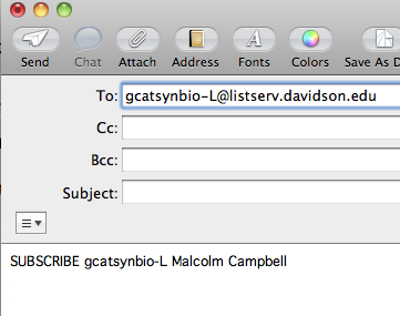 Messages intended for all subscribers to read and discuss should be sent to GCATSynBio-L@listserv.davidson.edu. Anyone who has subscribed to GCATSynBio-L can post an email to all readers.