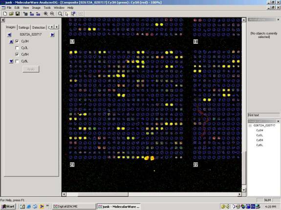 During that time, I met with Bruz to hear about the methods used for microarray data analysis. He showed me how they set up the scanner to read at a level where no spot reaches or exceeds the maximum reading, and then also at a level where all spots are high and some are maxed out. The average relationship between spot intensities can be used to calculate what the real value for a maxed out spot should be, and then that is used to correct the highı scans. They use spot finding software that allows two color scans at two intensities (all four scans) to be stacked and the spots defined for the whole stack.