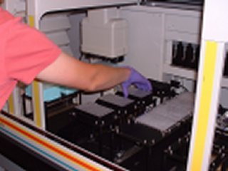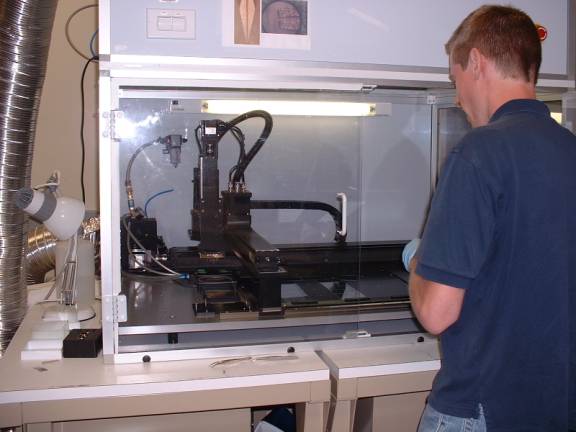Bruz checking out the operation of the microarray printer. The slides are laid out adjacent to each other and are in the area that resembles a glass plate just to Bruzıs left in this picture.
