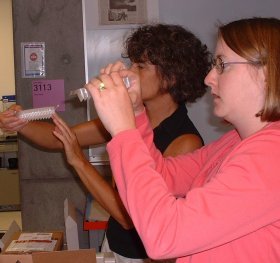 Barbara and Cheryl inspecting the PCR products in 96 well plates
