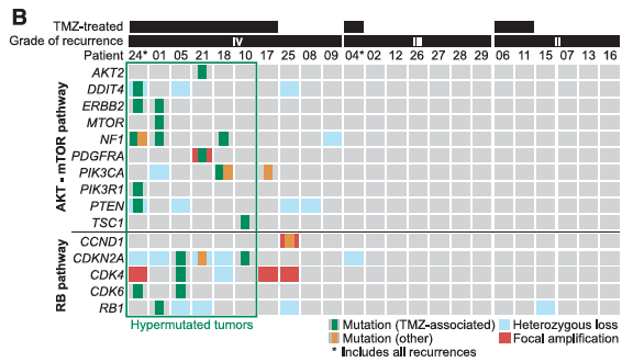 - Panel B: Depicts the high association of hypermutation in the AKT-mTOR pathway and the RB pathway in TMZ treated patients who had Grade IV recurrences. Of the hypermutations that occurred in the TMZ treated patients, the majority appear to have been TMZ-associated.