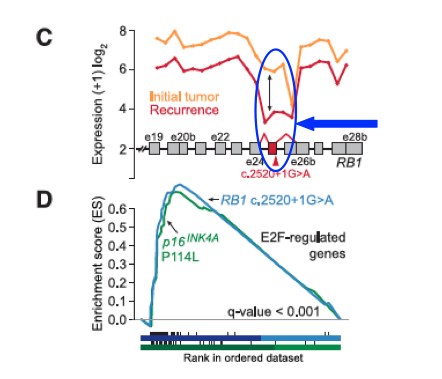 - Panel C: Notes the dramatic change in the RB pathway associated with the recurrent tumor in Patient 01; the recurrence has a mutation that alters the splicing of the mRNA, causing a large drop in expression (see circled region).
