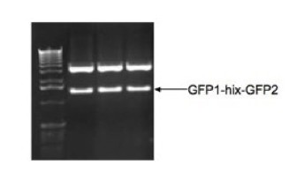 Previous studies have inserted short sequences into various regions of GFP without affecting protein function. I chose to insert HixC between amino acids 157 and 158 based on a study that successfully inserted a six-peptide sequence between aa 157 and 158 (Paramban et al, 2004). GFP has a compact cylinder structure consisting of 11 antiparallel β strands and a chromophore buried in the center. The chromophore is the region responsible for GFP fluorescence. Thus, a sequence can be inserted into one of the β barrel loops without affecting GFP function. Check out the interactive chime figure of GFP to see where HixC was inserted.