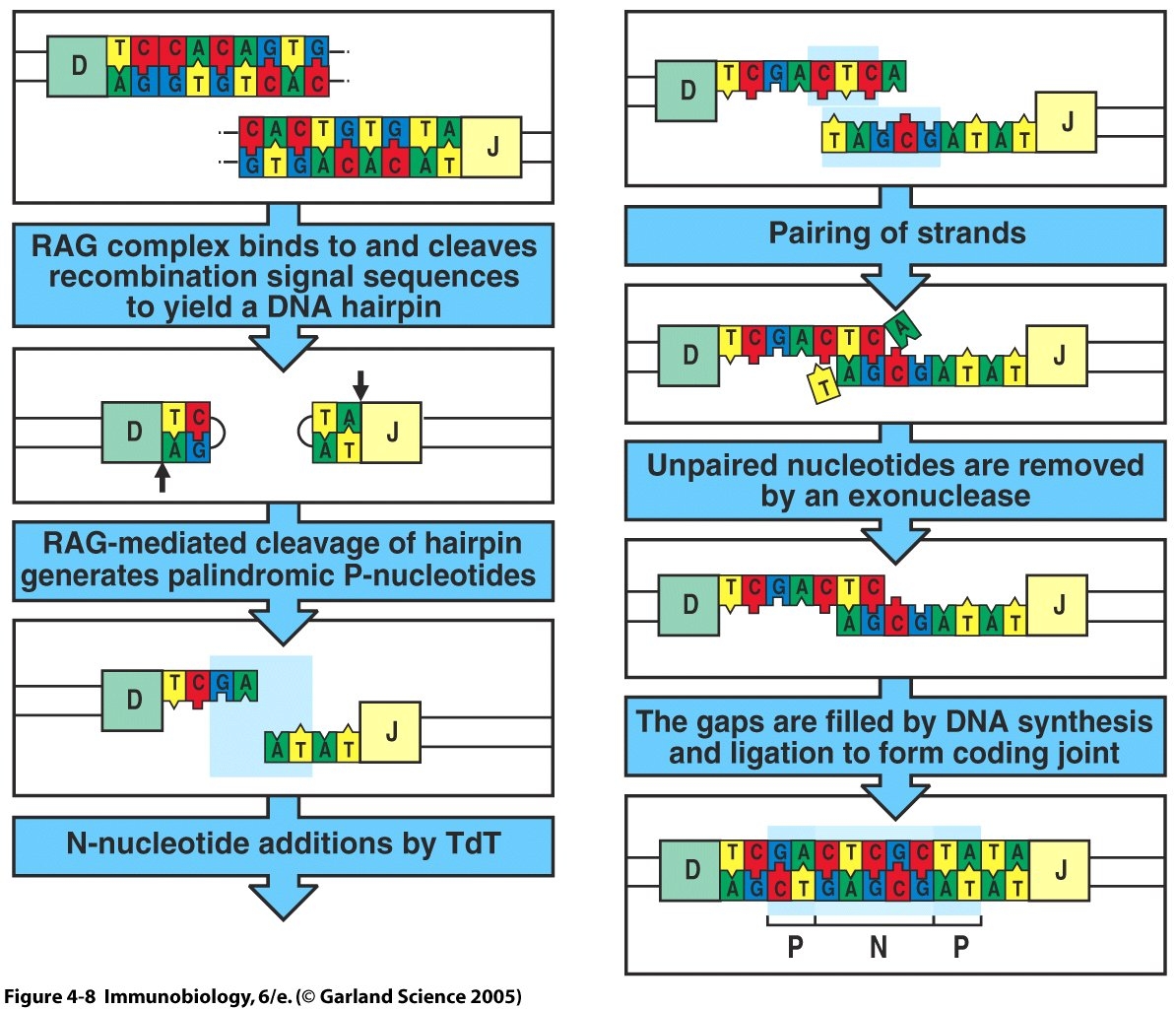 Figure 2. P and N-nucleotides are included in the coding joints between gene segments during lymphocyte gene rearrangement. These nucleotide additions occur after the RSS is cut and cleaved by RAG enzyme to form hairpin structures. N-nucleotides are added randomly before complementary pairing occurs, thus, increasing the variability of the recombined gene segments (Janeway et al., 2005)