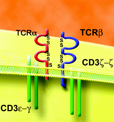 Figure 2: The final T cell receptor (TCR). Note that TCRα has replaced pTα. It has a drastically shorter cytoplasmic tail, implying that it does not directly transduce signals. Permission given by Dr. Iannis Aifantis, image given in personal correspondence.