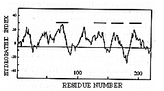 Figure 3. Hydropathy Plot of the Predicted ERD2 Protein The algorithm of Kyte and Doolittle (1982) was used, with a window of 11 amino acids. Hydrophobic portions are above the horizontal line. Bars above the plot indicate potential transmembrane segments.