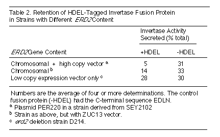 To identify essential components of this recycling pathway, we have used a genetic approach. Our strategy has been to isolate mutants of the yeast Saccharomyces cerevisiae that are defective in the retention system. Previous work has established that yeast uses HDEL, rather than KDEL, as an ER retention signal; that HDEL- containing proteins can leave the ER, receive Golgi-specific carbohydrate modifications, and then return; and that the retrieval system is saturable, as expected for a receptor- mediated process (Pelham et al., 1988; Dean and Pelham, 1990). Extensive mutagenesis resulted in the identification of two genes required for the retention in the ER of HDEL- tagged invertase fusion proteins; these were named erd1 and erd2 (for "ER retention defective"). We have recently shown that deletion of the ERD1 gene causes a pleiotropic defect in part of the Golgi apparatus, which evidently results in inefficient retrieval from this organelle (Hardwick et al., 1990).