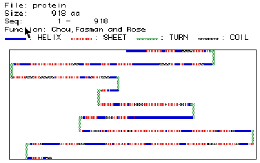 Fig. 4:  This figure shows the various location of alpha helices (blue), beta pleaded sheets (red), turns (green), and coils (balck).  This protein of 918 amino acids seems to have many alapha helicies and beta pleaded sheets through out the protein with 8 turns and a few coils regions.  This image can be compared to the RasMol image of hexokinase here.