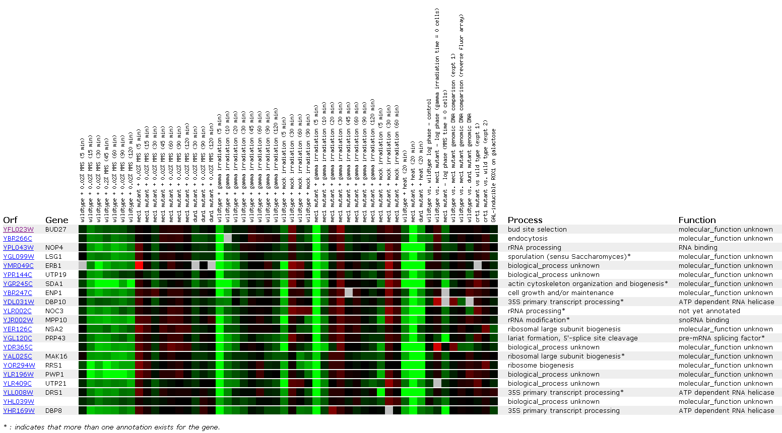 This microarray looks at numerous DNA-damaging conditions. In most instances, where there is any change in expression for BUD27, it is a repression. The first set of data are the expression ratios of wildtype cells compared with wildtype cells exposed to methyl-methanesulfonate (MMS), a chemical DNA-damaging agent, for different lengths of time. The next set is wildtype cells compared with mec1 mutants that were exposed to MMS for different lengths of time. Mec1 is a DNA repair gene. Thus, if DNA is being damaged and it can't be repaired, one would expect a different set of expression ratios compared to wildtype DNA that still has its DNA repair gene. And in fact, that is what we see. BUD27 is repressed when wildtype cells are exposed to MMS but not when mec1 deletants are exposed. In the wildtype cells, MEC1 is still present and is able to recognize the DNA damage and tell the cell about that damage. There's nothing telling the cell that DNA is damaged in the mec1 deletants, so they continue with their "wildtype" activities and do not alter the expression of some of their genes. Also, in each set of conditions, BUD27 acts similarly to RNA binding genes and some other ribosomal genes, such as ones encoding RNA helicases..