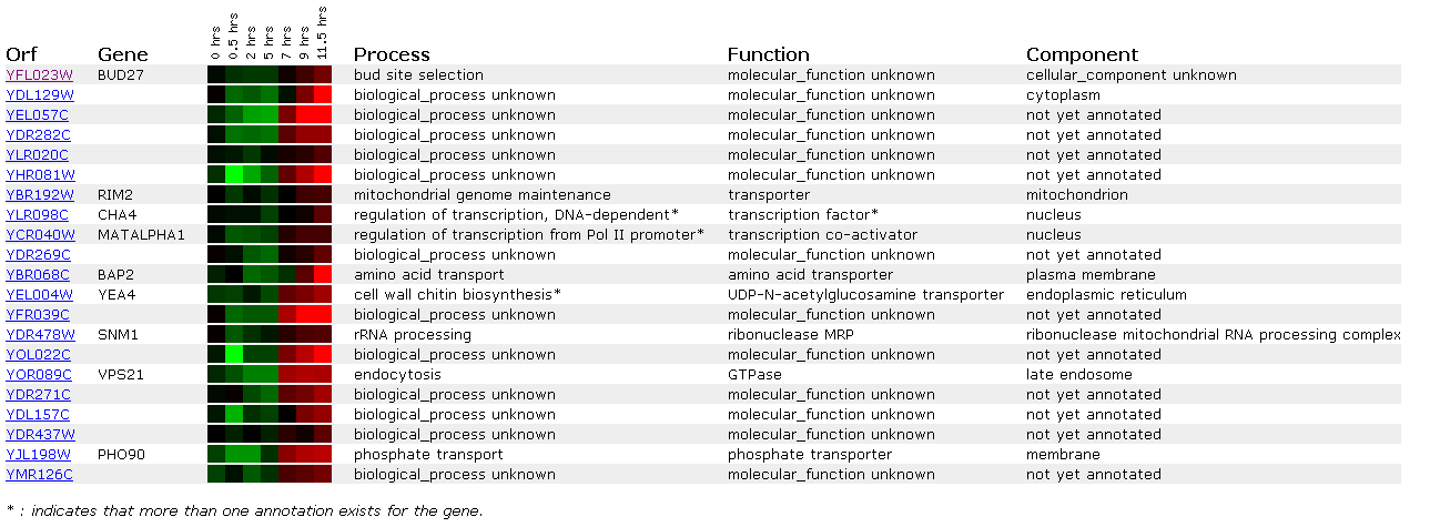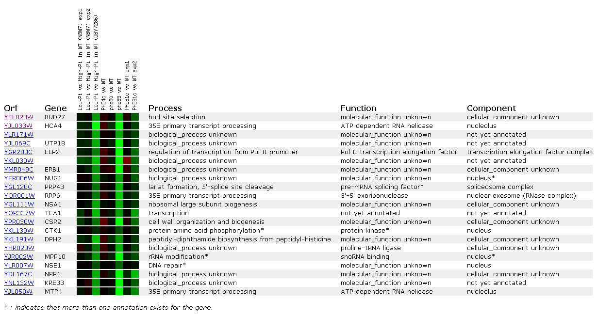 A low phosphate concentration in the medium makes yeast induce a set of genes to adapt to the low-phosphate environment. This gene expression regulation is known as the "PHO" regulatory system. Thus, the genes above are repressed when phosphate is limited. BUD27 acts like genes involved in 35S primary transcript processing and some rRNA modification. Again, BUD27 could have processing or regulatory roles involved transcripts in yeast. Unfortunately though, the genes closest to it in expression ratios are not annotated genes. It is interesting to note that so far, no other "BUD" genes have been observed on any of these microarrays. This fact still leads me to believe that BUD27 is a transcriptional regulator of those genes responsible for budding, instead of those genes themselves.