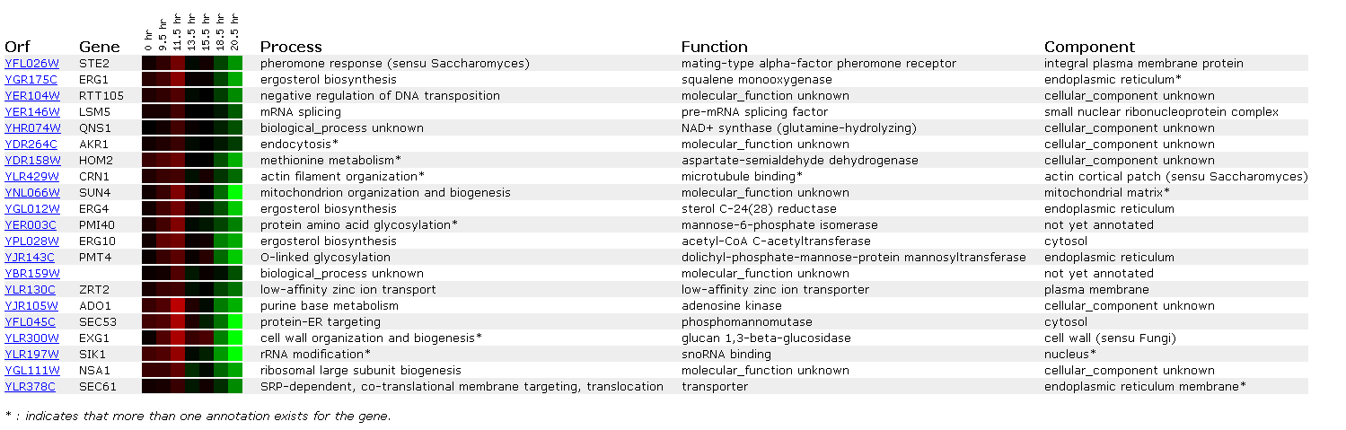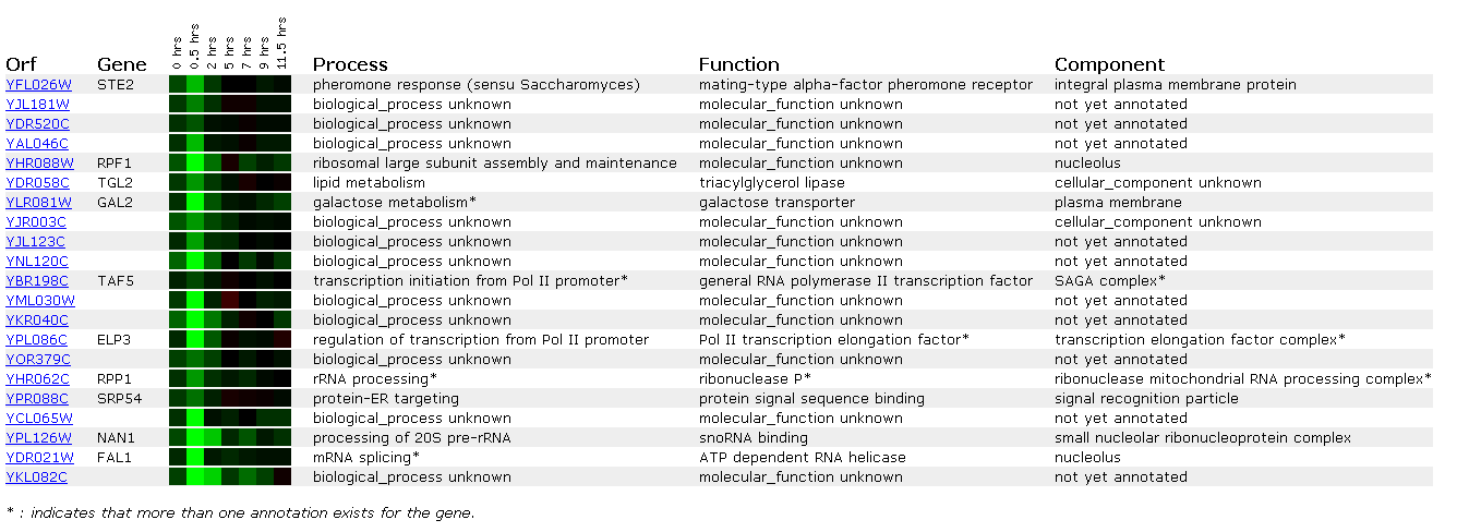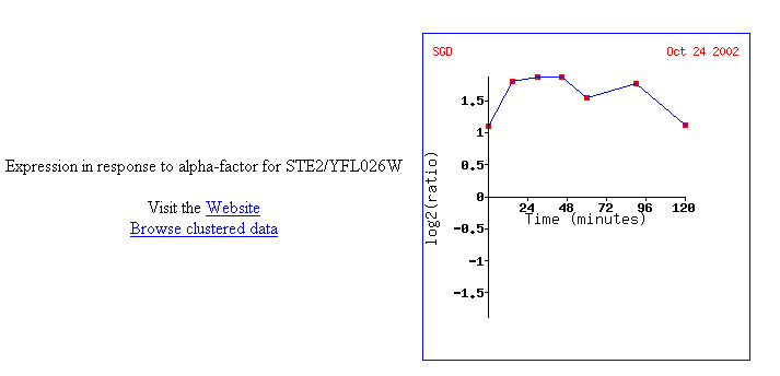 Function Junction is another website used to assess the function of yeast genes. The database includes information gathered from six other databases. For STE2, we are not questioning its function, but merely illustrating that what we know about it corresponds to the information obtained from these databases. Each database does say that STE2 encodes the alpha-factor pheromone receptor and that that receptor is a 7-transmembrane protein embedded in the plasma membrane. The best database that is searched using Function Junction is the Yeast Microarray Global Viewer from the Laboratoire de genetique moleculaire, Paris, France. Function Junction takes a selection of these microarrays and shows how your specific gene is expressed under certain conditions.