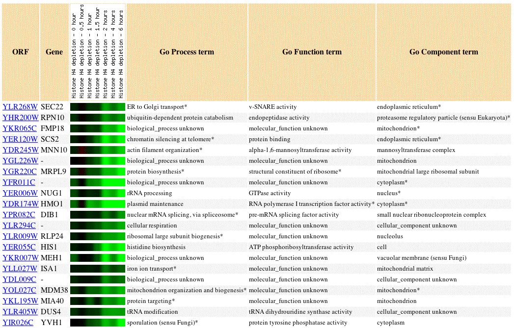Histones are proteins that package DNA into nucleosomes. In the above experiment histones were allowed to be depleted in the experimental condition. Loss of histones caused repression of SEC22. Other genes involved in protein/tRNA targetting and transport showed similar expression profiles to SEC22: MIA40, DIB1, NUG1, DUS4. This is consistent with our knowledge of SEC22 as a gene involved in fusion events of the ER membrane because protein transport through the ER is closely tied to post-translational modification.
