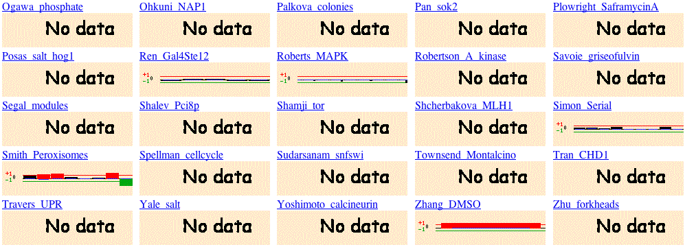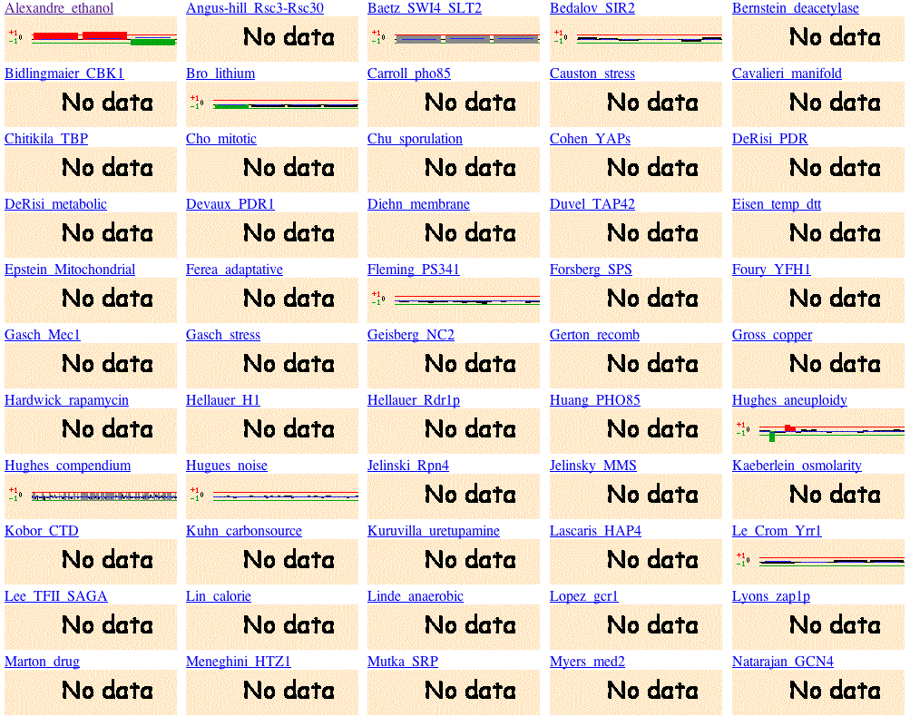 Fig 8. Microarray Global viewer obtained from Function Junction search. To duplicate these results, type YLR262C-A into the following search site and scroll down the page until you see the heading, microarray global viewer (Function Junction, 2004; <http://db.yeastgenome.org/cgi-bin/SGD/functionJunction>).