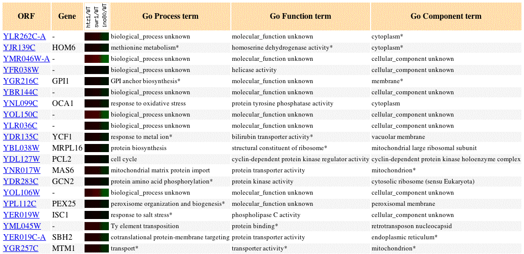 Fig 7. Image of YLR262C-A expression profile in response to gene regulation by as well as the expression profiles of 19 similar genes (Pearson's correlation coefficient, p>0.8). Mizuguchi et. al. was the only paper that returned a returned a result for YLR262C-A. Image adapted from: (SGD, 2004; <http://db.yeastgenome.org/cgi-bin/expression/expressionConnection.pl?orf=YLR262C-A&dataset=swr1_htz1_ino80&type=similar>). Obtain my search result by visiting the search page listed at the end of the paragraph. Type YLR262C-A into the search box, and mark all the papers. (SGD, 2004 <http://db.yeastgenome.org/cgi-bin/expression/expressionConnection.pl>)