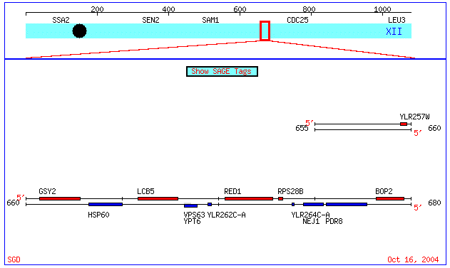 Fig 6. Visualization of proximity of YLR264C-A and YLR262C-A on Chromosome XII of the Saccharomyces genome (coordinates: 659470 - 679664). Image from: (Cherry et. al., 1997; <SGD Picture>). Permission Granted.
