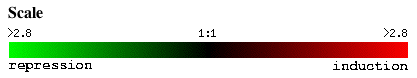 Fig 1. This is the color scale employed in pictures from Expression Connection. Red indicates gene induction in the experimental condition. Green indicates gene repression in the experimental condition.