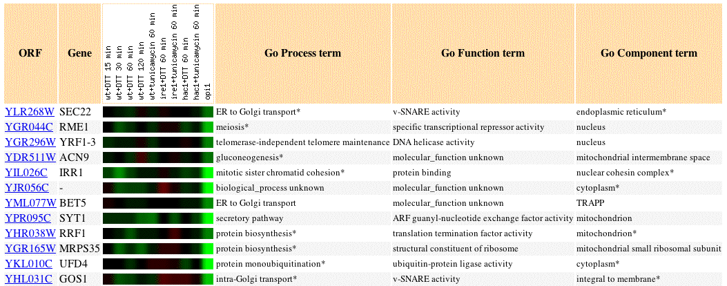 The unfolded protein response (UPR) is the coordinated induction or repression of genes in response to Endoplasmic Reticulum (ER) stress. A study that investigates UPR is expecially important because SEC22 is supposedly involved in ER to Golgi transport. The above figure illustrates genes with expression profiles similar to SEC22 that are involved in translation and secretory pathways: BET5, GOS1, SYT1, RRF1. The fact that genes with similar GO Processes have similar expression profiles supports the guilt by association hypothesis for this data set and supports current knowledge of SEC22 function.