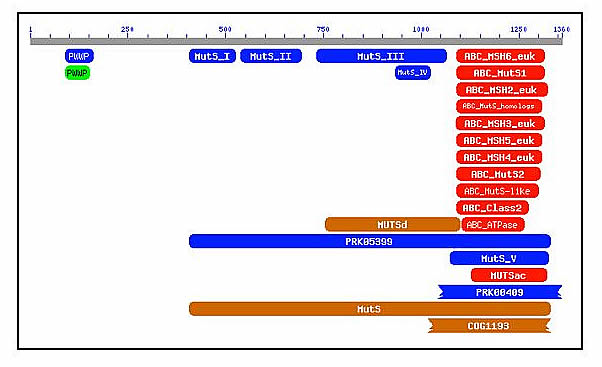 The high conservation of the biological properties of MSH6 among so many species suggests that its function is particularly crucial in survival. While the entire MSH6 gene is fairly well preserved in most species, there are several regions within the gene that are particularly similar across species. The region from approximately amino acid 1000 to amino acid 1360 is very well conserved [Figure 2], with orthologs in multiple species as well as high conservation with other MSH sequences (ie MSH2, MSH3, etc) with e-values from 2 e-84 to 9 e-9 [NCBI Conserved Domains]. Since this region of the MSH6 gene is very well conserved, it suggests that it is particularly important in the proper functioning of the gene in DNA repair.