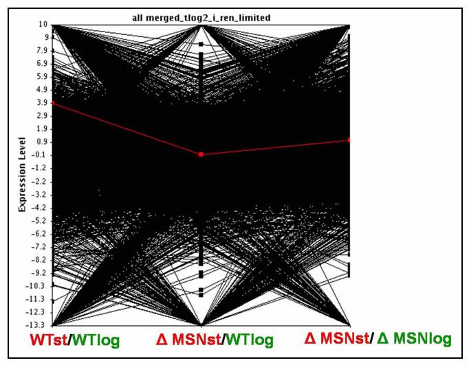 The Hoopes Lab at Washington University in St. Louis generously provided us with microarray data that looked at the effect of several deletions and growth states on genomic expression in yeast. Some of these microarrays looked at the effects of a deletion in MSN2/MSN4. MSN2 and MSN4 are both related to the activation of transcription. They bind elements of some DNA during stressful conditions and induce the expression of those genes [NCBI]. In addition to assessing the effects of the MSN deletions, the Hoopes lab looked at the effects of stationary versus log phase growth.