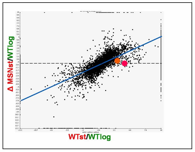 In order for MSH6 to function in DNA repair in vivo, it must form a heterodimer with the protein of the MSH2 gene [Acharya 1996]. As a result, the function of MSH2 in response to an MSN4/6 deletion was also assessed to determine whether or not MSH2 and MSH6 are potentially regulated by some common factor. In the presence of deletions in MSN4 and MSN6, MSH2 and MSH6 responded in a similar manner, suggesting that MSH2 [pink dot] and MSH6 [orange dot] are controlled by some common factor [Figure 2].
